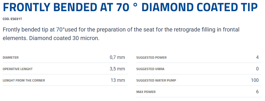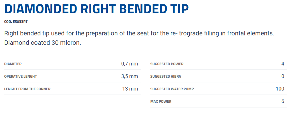 • Εξειδικευμένα άκρα ακρορριζεκτομής: Σχεδιασμένα για να διευκολύνουν την αποτελεσματική αφαίρεση του ακρορριζικού τμήματος του δοντιού, μειώνοντας τον χρόνο επέμβασης.